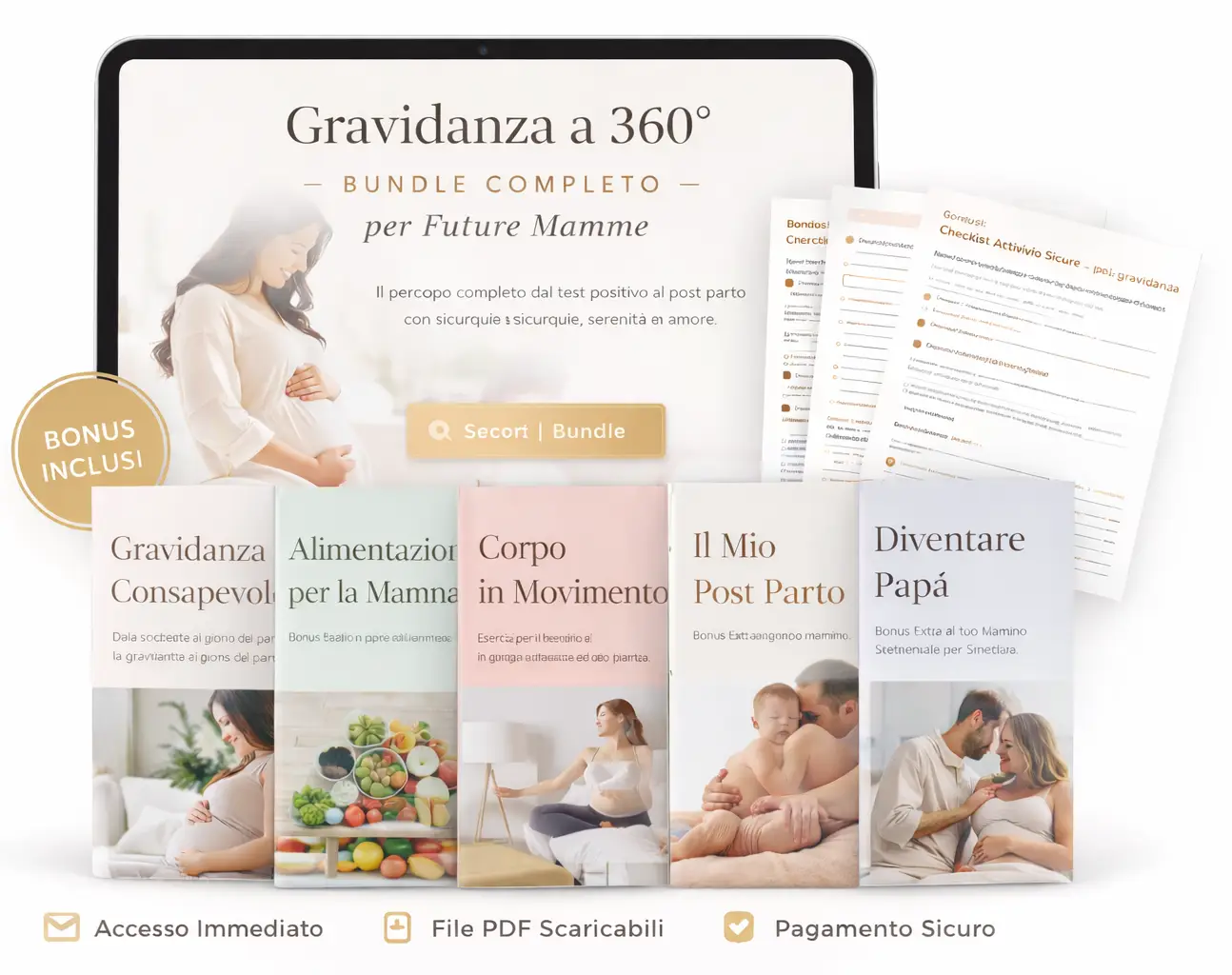 Il Bundle “Gravidanza a 360°” è un kit digitale pensato per accompagnarti dal test positivo fino ai primi giorni dopo il parto.